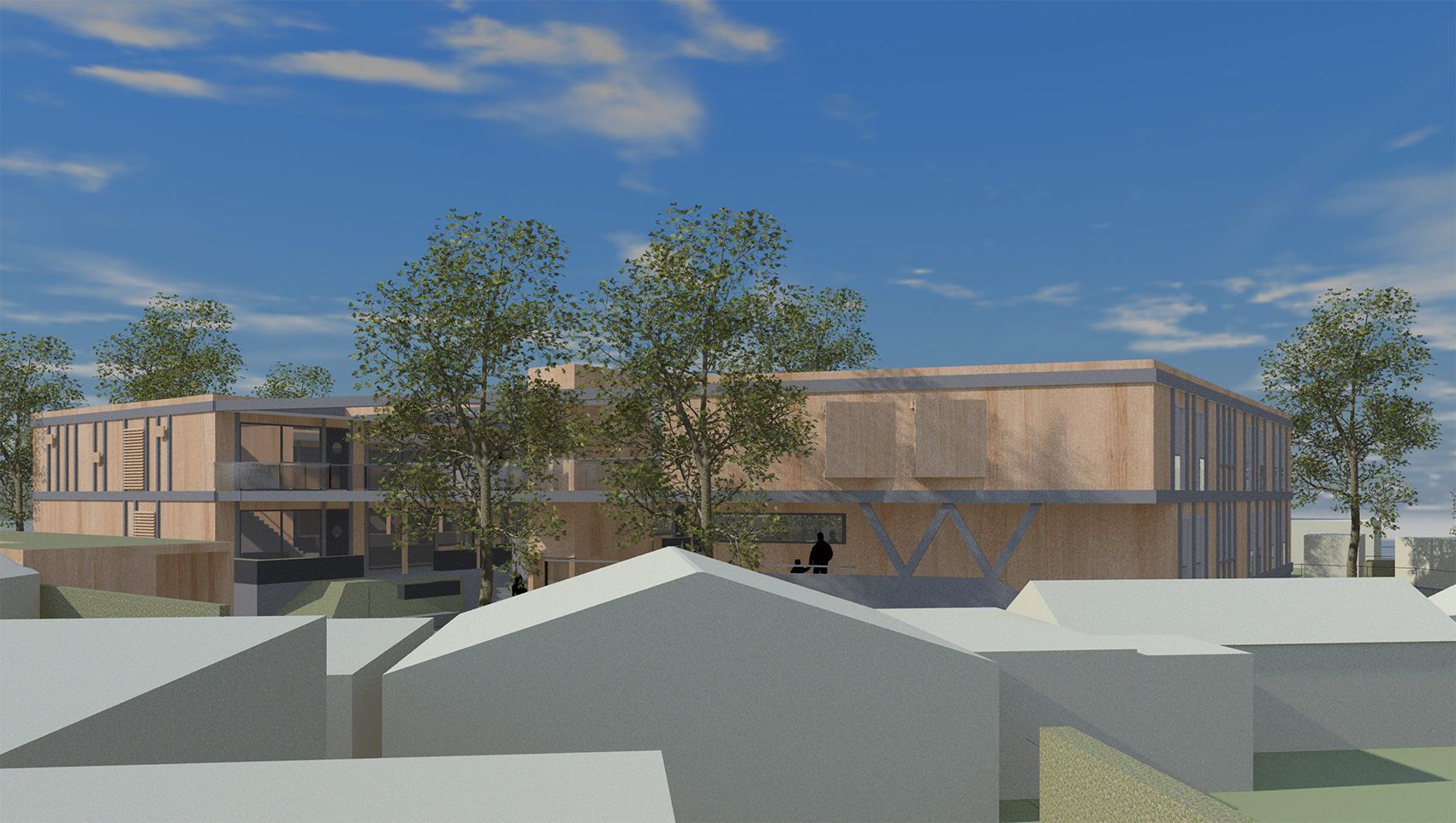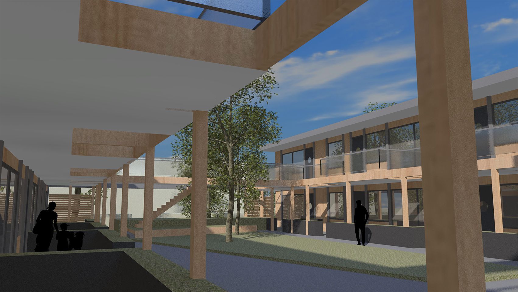 Het omliggende terrein en de gemeenschappelijke binnentuin zullen een vriendelijke groene uitstraling krijgen. De plint van de halfverdiepte kelder vormt een steenachtig basement. De bovenbouw krijgt een zorgvuldig gedetailleerde en in kleur gebeitste houten gevelbekleding. De gelamineerde houten onderconstructies van de galerijen en de balkons en de belijning in de gevels zullen behandeld worden met een transparante afwerking. De parkeerplaatsen voor auto’s en fietsen zijn grotendeels in de kelder ondergebracht.